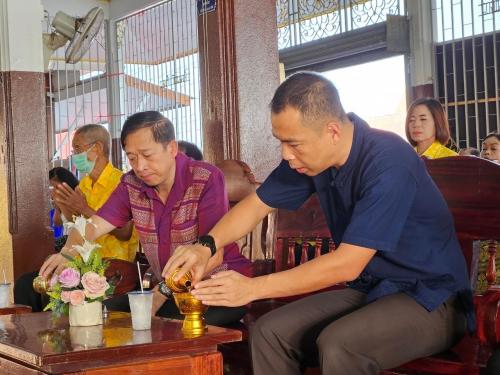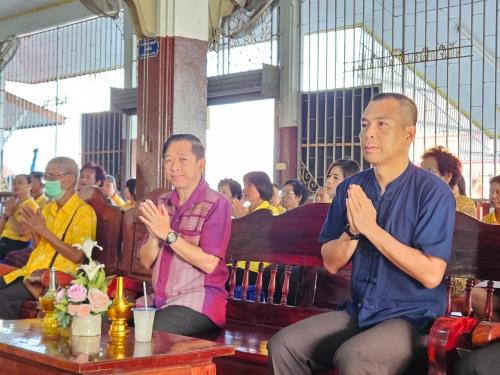 นายสมศักดิ์ จิตรวิไลย พัฒนาการอำเภอบางน้ำเปรี้ยว พร้อมด้วยเจ้าหน้าที่พัฒนาชุมชนอำเภอบางน้ำเปรี้ยว จัดกิจกรรมแต่งผ้าไทยใส่บาตร ตามโครงการอาสาแก้จนเฉลิมพระเกียรติ ในหลวงรัชกาลที่ 10