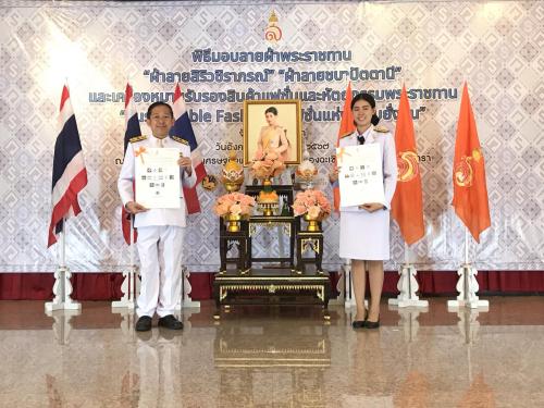 โดยมีนายชลธี ยังตรง ผู้ว่าราชการจังหวัดฉะเชิงเทรา เป็นประธานในพิธีมอบแบบลายผ้าพระราชทาน “ผ้าลายสิริวชิราภรณ์” “ผ้าลายชบาปัตตานี” และเครื่องหมายรับรองสินค้าแฟชั่นและหัตถกรรมพระราชทาน “Sustainable Fashion : แฟชั่นแห่งความยั่งยืน” พร้อมด้วยนางพัทธานันท์ ยังตรง ประธานแม่บ้านมหาดไทยจังหวัดฉะเชิงเทรา นางสาวฉัตรประอร นิยม รองผู้ว่าราชการจังหวัดฉะเชิงเทรา นางรัดใจ สิริรัตตนนท์ รองประธานแม่บ้านมหาดไทยจังหวัดฉะเชิงเทรา นายธนพัฒน์ เจียรสถิต รองนายกองค์การบริหารส่วนจังหวัดฉะเชิงเทรา นายปัณณธร ล่ามแขก พัฒนาการจังหวัดฉะเชิงเทรา หน่วยงานราชการกระทรวงมหาดไทย วัฒนธรรมจังหวัดฉะเชิงเทรา ประชาสัมพันธ์จังหวัดฉะเชิงเทรา นายอำเภอ พัฒนาการอำเภอ และช่างทอผ้า กลุ่มทอผ้า และผู้ผลิตผ้าทุกกลุ่ม ทุกเทคนิคในจังหวัดฉะเชิงเทรา ร่วมพิธีฯ จำนวน 50 คน