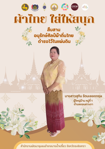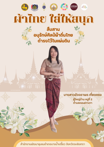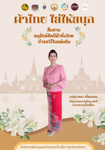 พช.บางน้ำเปรี้ยว ขอเชิญชวนหน่วยงานราชการ องค์กรปกครองส่วนท้องถิ่น และประชาชนทั่วไป ร่วมสวมใส่ผ้าไทย เพื่อสืบสานอนุรักษ์ศิลป์ผ้าถิ่นไทย ให้ดำรงสืบไป ตามพระดำริสมเด็จพระเจ้าลูกเธอ เจ้าฟ้าสิริวัณณวรี นารีรัตนราชกัญญา