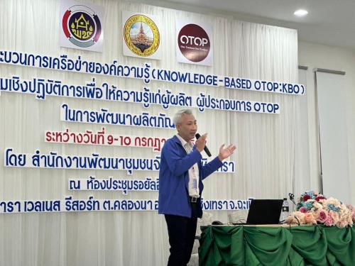 นายสมศักดิ์ จิตรวิไลย พัฒนาการอำเภอบางน้ำเปรี้ยว มอบหมายให้นางสาวปาลภัสสร์ ทองสุข นักวิชาการพัฒนาชุมชนปฏิบัติการ พร้อมด้วย ผู้ผลิต ผู้ประกอบการ OTOP จำนวน 2 กลุ่ม จากอำเภอบางน้ำเปรี้ยว ได้แก่ กลุ่มเศรษฐกิจพอเพียงบ้านหลักร้อย หมู่ 6 ตำบลบางขนาก และกลุ่มสัมมาชีพชุมชนน้ำพริกแกง หมู่ 13 ตำบลโพรงอากาศ เข้าร่วมโครงการส่งเสริมกระบวนการเครือข่ายองค์ความรู้ (Knowledge – Based OTOP : KBO) กิจกรรมประชุมเชิงปฏิบัติการให้ความรู้แก่ผู้ผลิต ผู้ประกอบการ OTOP